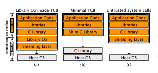 When planning for SGX’s “trusted compute base,” which would run inside the enclave, SCONE researchers were led by two chief requirements: One was to keep the code base as small as possible, in order to minimize the attack surface. The other would be to maintain performance by not introducing excessive latency, which was inherent in the “enclave” model insofar that any system call to made the kernel would necessitate the thread jumping outside the enclave, with all the attendant memory copying involved.